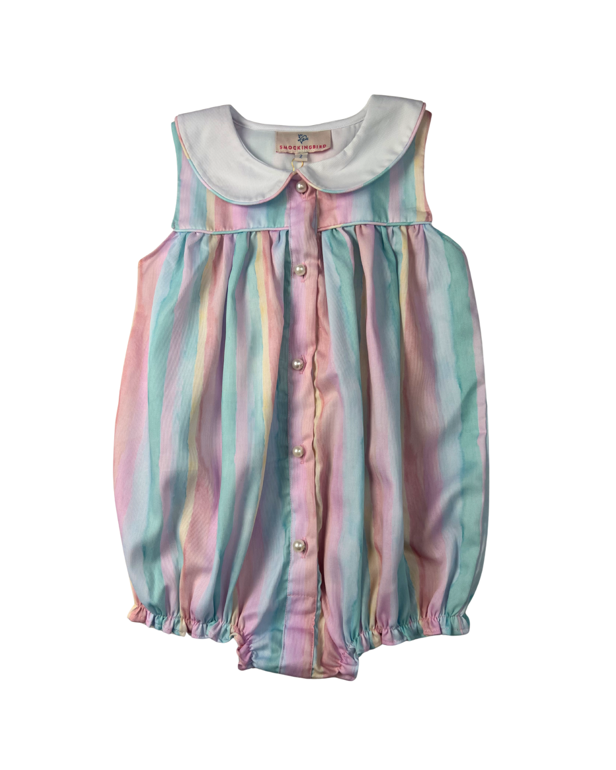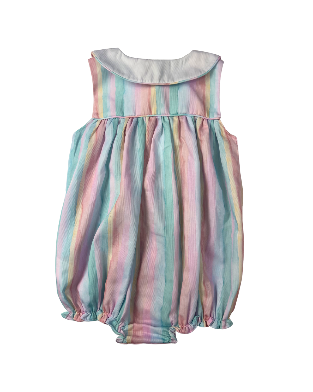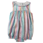 This pastel rainbow striped bubble features a crisp white collar and soft gathered waist. Elastic leg openings provide a secure and comfortable fit for active summer days. Bottom snap closures allow for easy changes. A darling summer outfit for photos, vacations, and everyday wear.