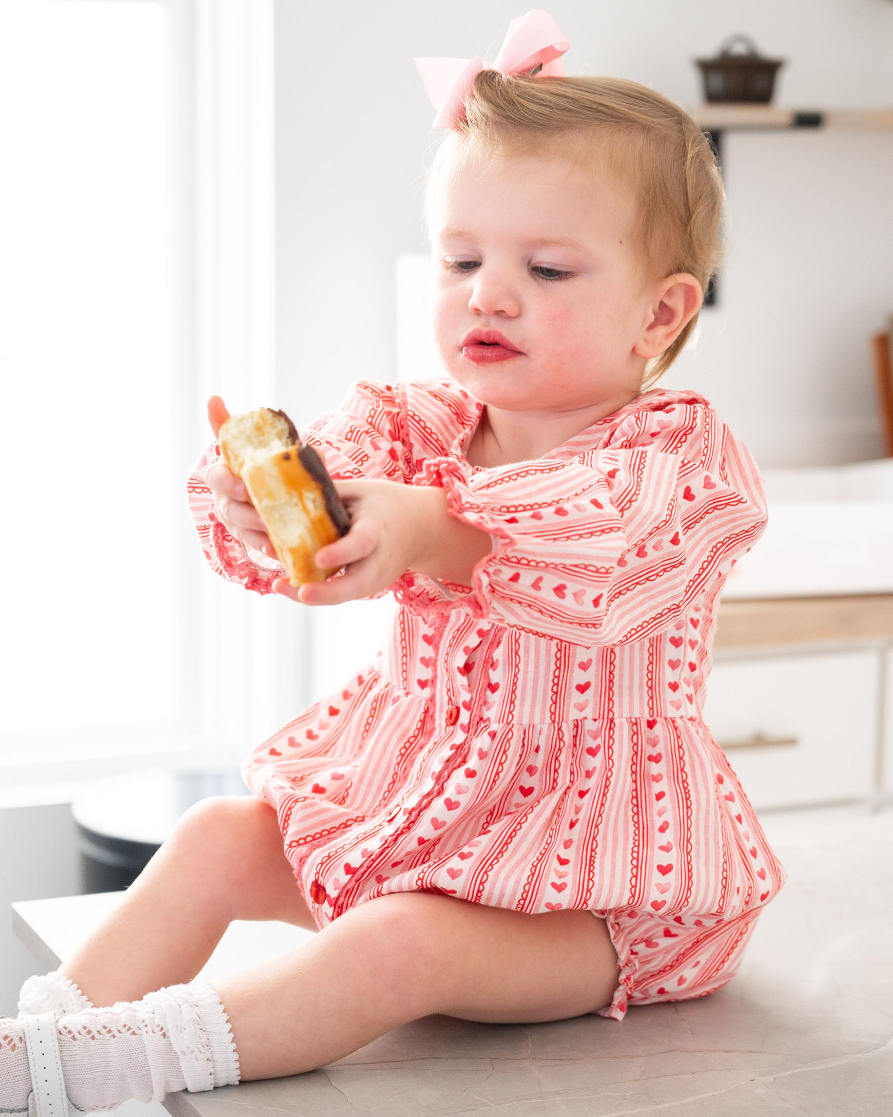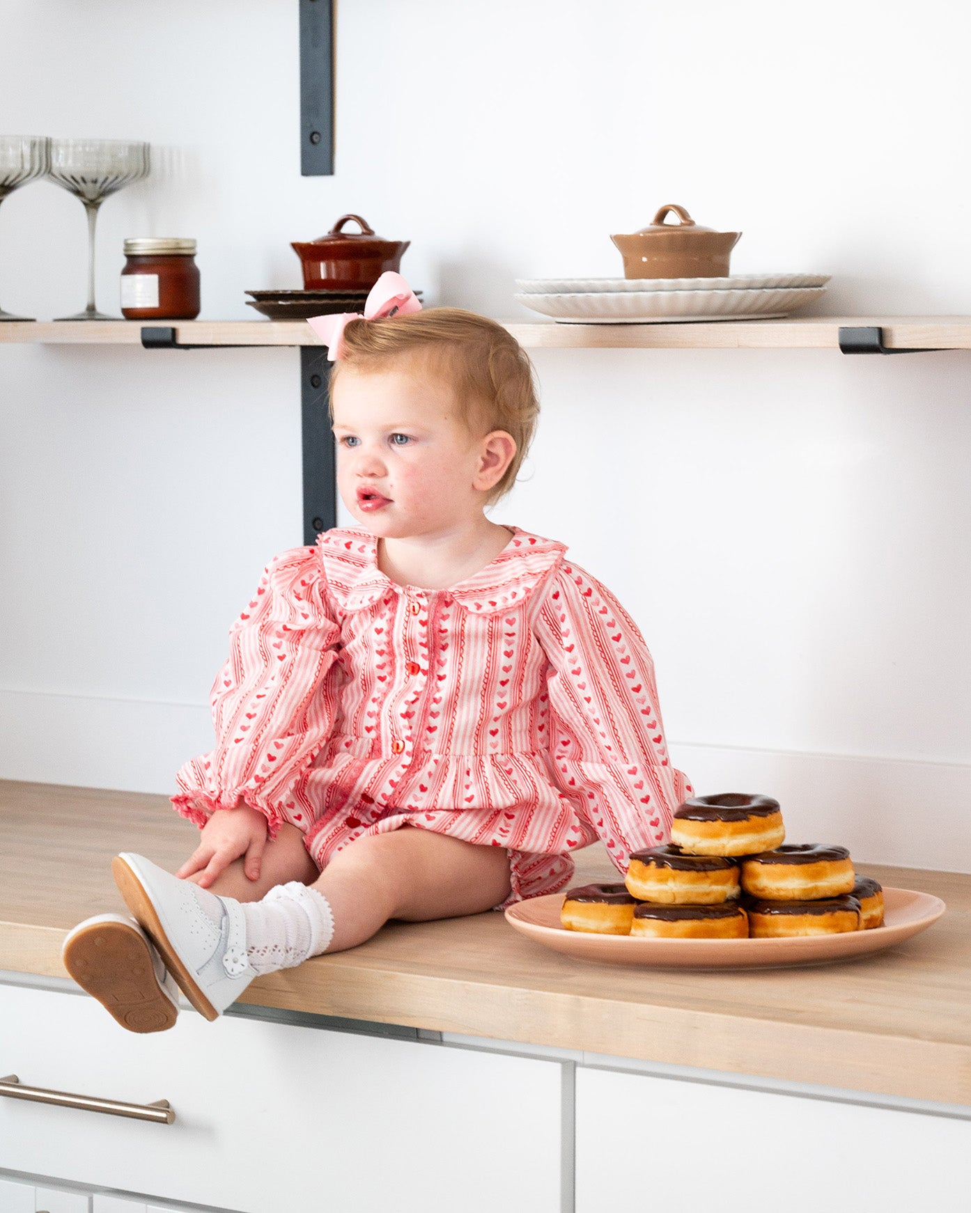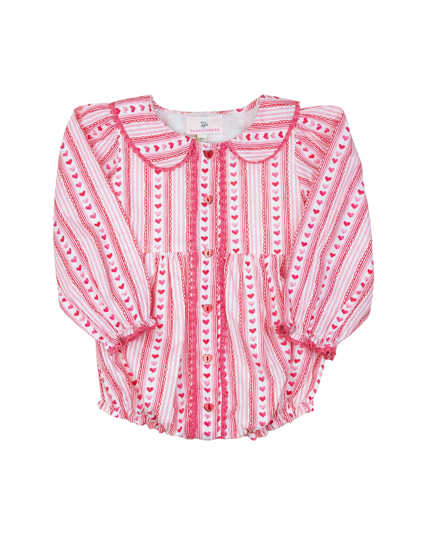 Adorn your little one in adorable charm with our Valentine Stripe Bubble! This delightful piece features classic stripes, picot trim, and heart-shaped buttons for a playful and cozy fit. Easy snap closures ensure quick changes, making it perfect for Valentine's parties or everyday sweetness.